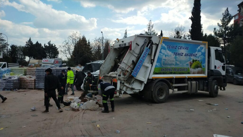 Deprem bölgelerinde yığılan çöp alanlarına da Yenişehir ve Akdeniz Belediyesi el attı. Her iki belediye de bölgeye Temizlik İşleri Müdürlüğü bünyesindeki personel ve araçları göndererek çöp toplamaya başladı.