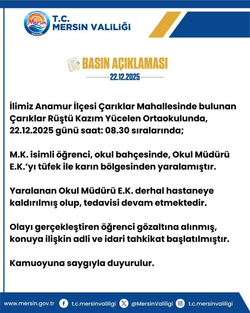 Ağır yaralanan okul müdürü, olay yerindeki ilk müdahalenin ardından önce yerel bir hastaneye, durumunun ciddiyetini koruması üzerine ise Mersin’e sevk edildi. İlçenin mülki amirleri ve başsavcı da hastaneye giderek durumu yakından takip etti.
