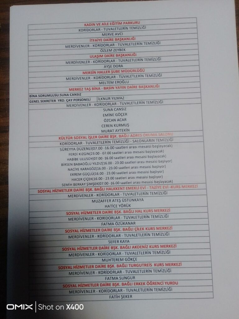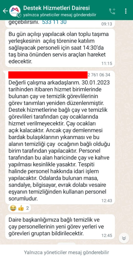 CHP’li Mersin Büyükşehir Belediyesi Başkanlığı Destek Hizmetleri Dairesi Başkanlığı Whatsapp grubu üzerinden 29 Ocak 2023 tarihinde atılan “Değerli çalışma arkadaşlarım. 30.01.2023 tarihinden itibaren hizmet birimlerinde bulunan çay ve temizlik görevlilerinin görev tanımları yeniden düzenlenmiştir. Destek hizmetlerine bağlı çay ve temizlik görevlileri tarafından çay ocaklarında hizmet verilmeyecektir. Çay ocakları açık kalacaktır. Ancak çay demlenmesi bardak bulaşıklarının yıkanması ve bu alanın temizliği çay ocağının bağlı olduğu birim tarafından yapılacaktır. Personel tarafından bu alan haricinde çay ve kahve yapılması kesinlikle yasaktır. Tespiti halinde personel hakkında idari işlem yapılacaktır. Odalarda bulunan masa, sandalye, bilgisayar, evrak dolabı vesaire eşyanın temizliğinden kullanan personel sorumludur.” şeklindeki mesajla destek hizmet birimlerinde çalışan yüzlerce çay ve temizlik görevlileri sürgün yedi.