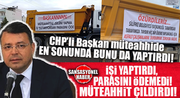 Silifke’de yol yapım işini üstlenen bir müteahhit, 7 aydır ödeme alamadığını iddia ederek kamyonlarının kasasına astığı dev pankartlarla dikkat çeken bir protestoya imza atmıştı.