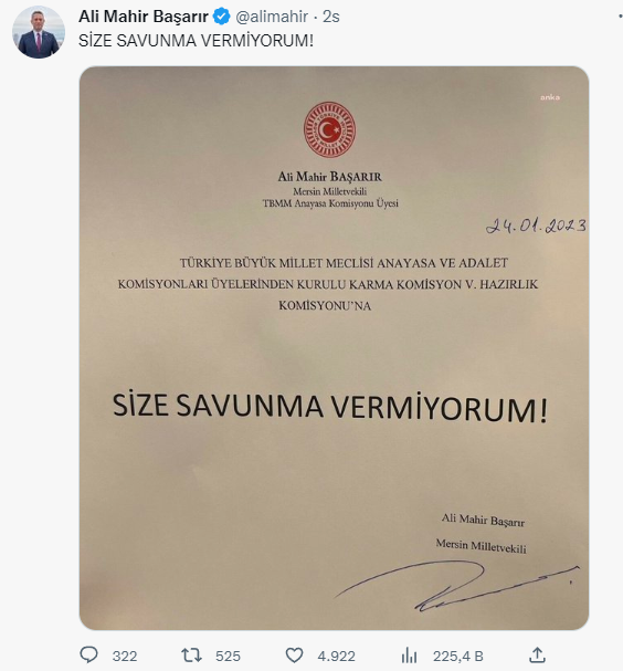CHP Mersin Milletvekili Ali Mahir Başarır, TBMM’de; yasama dokunulmazlığının kaldırılması fezlekesinin incelenmesi için kurulan Hazırlık Komisyonu’na; üzerinde sadece “Size savunma vermiyorum” cümlesinin yer aldığı yazılı dilekçesini iletti.