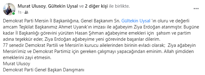 Murat Ulusoy, “Demokrat Parti Mersin İl Başkanlığına, Genel Başkanım Sayın Gültekin Uysal’ın oluru ve değerli amcam Teşkilat Başkanımız Ahmet Uyanık’ın imzası ile ağabeyim Ziya Erdoğan atanmıştır. Bugüne kadar İl Başkanlığı görevini yürüten Hasan Şıhman ağabeyime emekleri için şahsım ve partim adına teşekkür eder, Ziya Erdoğan ağabeyime yeni görevinde başarılar dilerim. 77 senedir Demokrat Partili ve Mersin’in kurucu ailelerinden birinin evladı olarak; Ziya ağabeyin Mersin’imiz ve Demokrat Partimiz için gereken çalışmayı yapacağından eminim. Allah şimdiden emeklerini zayi etmesin” dedi.