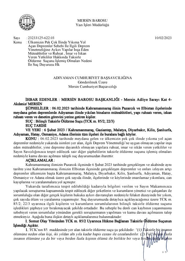 10 ilde yıkıma sebep olarak 32 bine yaklaşan kişinin ölümün yol açan deprem enkazında kalan afetin ardından Mersin Barosu, 10 il Başsavcılıklarına yıkılan bina müteahhitleri ve ruhsat veren kişiler hakkında suç duyurusunda bulundu.