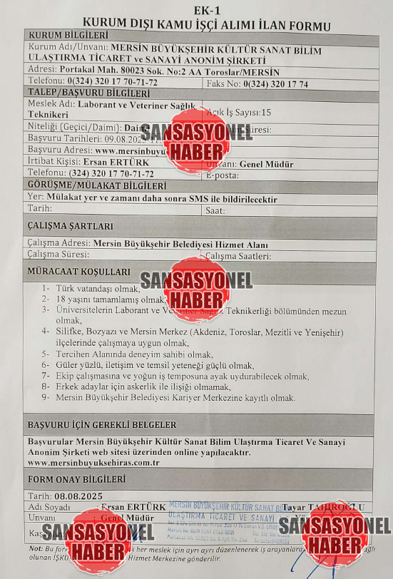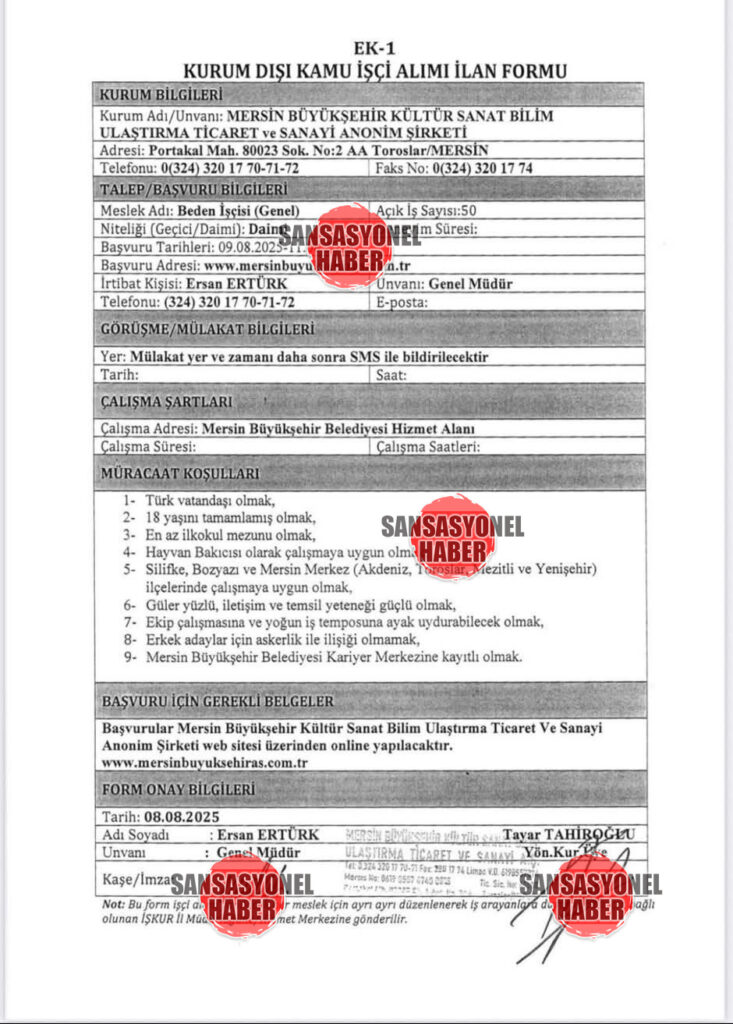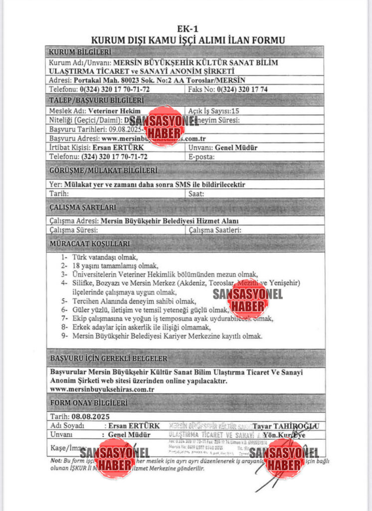 Üst düzey değişimin ardından CHP’li Vahap Seçer, veteriner kadrosunda eksik olduğu gerekçesiyle ani bir personel alım listesi yayımlandı. Buna göre Mersin Büyükşehir Belediyesi, İŞKUR üzerinden 15 laborant ve veteriner sağlık teknikeri, hayvan bakımında tecrübeli 50 beden işçisi ve 15 veteriner hekim alımı için ilana çıktı.