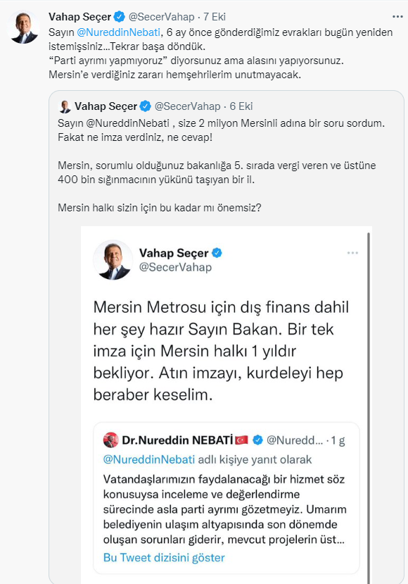 CHP’li Seçer, Bakan Nebati’yi etiketleyerek, “Mersin Metrosu için dış finans dahil her şey hazır Sayın Bakan. Bir tek imza için Mersin halkı 1 yıldır bekliyor. Atın imzayı, kurdeleyi hep beraber keselim” çağrısı yapmıştı. Bakan’dan cevap alamayan CHP’li Vahap Seçer, yeni bir tweet atarak, “Sayın Nureddin Nebati, size 2 milyon Mersinli adına bir soru sordum. Fakat ne imza verdiniz, ne cevap! Mersin, sorumlu olduğunuz bakanlığa 5. sırada vergi veren ve üstüne 400 bin sığınmacının yükünü taşıyan bir il. Mersin halkı sizin için bu kadar mı önemsiz?” diye yazmıştı.