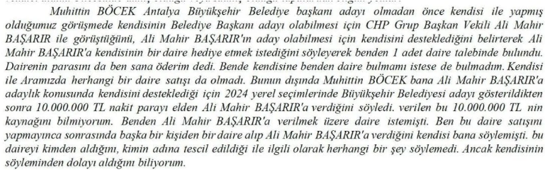 “Muhittin Böcek Antalya Büyükşehir Belediye başkanı adayı olmadan önce kendisi ile yapmış olduğumuz görüşmede kendisinin Belediye Başkanı adayı olabilmesi için CHP Grup Başkan Vekili Ali Mahir Başarır ile görüştüğünü, Ali Mahir Başarır’ın aday olabilmesi için kendisini desteklediğini belirterek, Ali Mahir Başarır’a kendisinin bir daire hediye etmek istediğini söyleyerek benden 1 adet daire talebinde bulundu.
