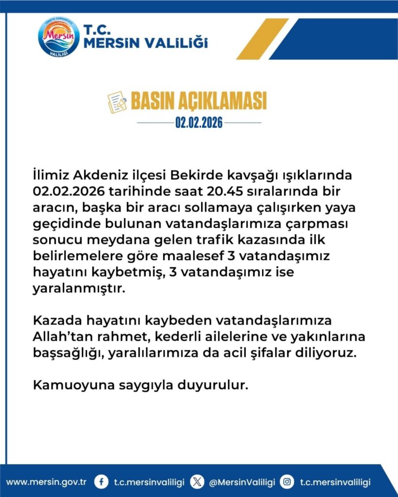 Mersin Valiliği’nden yapılan açıklamaya göre, kaza 2 Şubat 2026 tarihinde saat 20.45 sıralarında Akdeniz ilçesi Bekirde Kavşağı’nda meydana geldi.