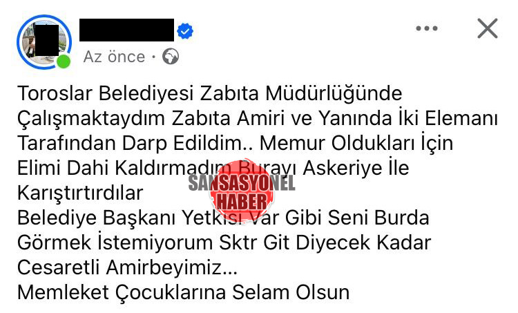 Toroslar Belediyesi’nde görev yapan E.T, sosyal medya hesabından yaptığı açıklamayla Zabıta Amirliği’nde darp edildiğini öne sürdü. E.T, zabıta amiri ile birlikte iki personelin kendisine fiziksel saldırıda bulunduğunu iddia etti.