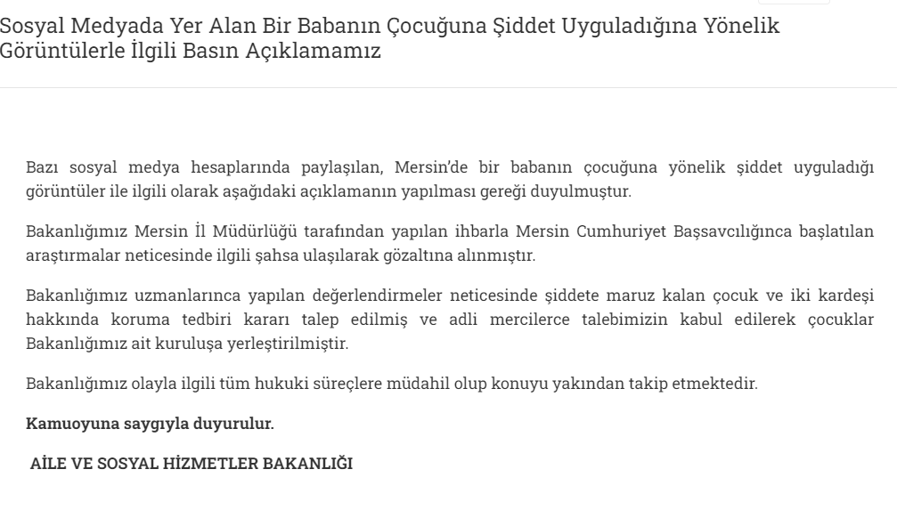 Akdeniz ilçesinde ikamet eden S.S’nin evdeki diğer çocuklarına da şiddet uyguladığı tespitinin üzerine Aile ve Sosyal Hizmetler Bakanlığı devreye girdi. Bakanlık, yapılan incelemenin ardından yazılı bir açıklama yayınlayarak S.S’nin gözaltına alındığını ve 3 çocuğuna da koruma kararı aldırıldığını açıkladı.